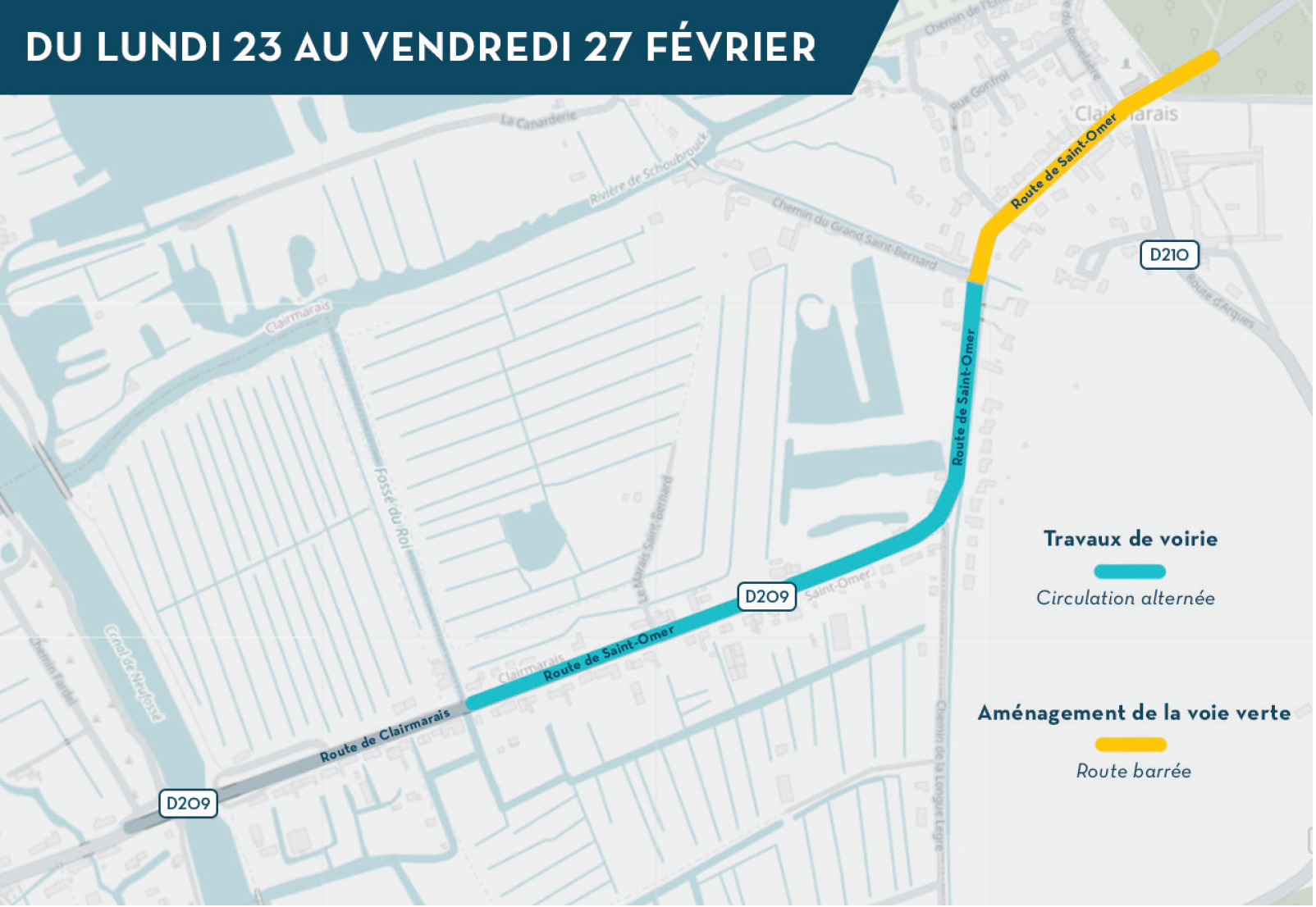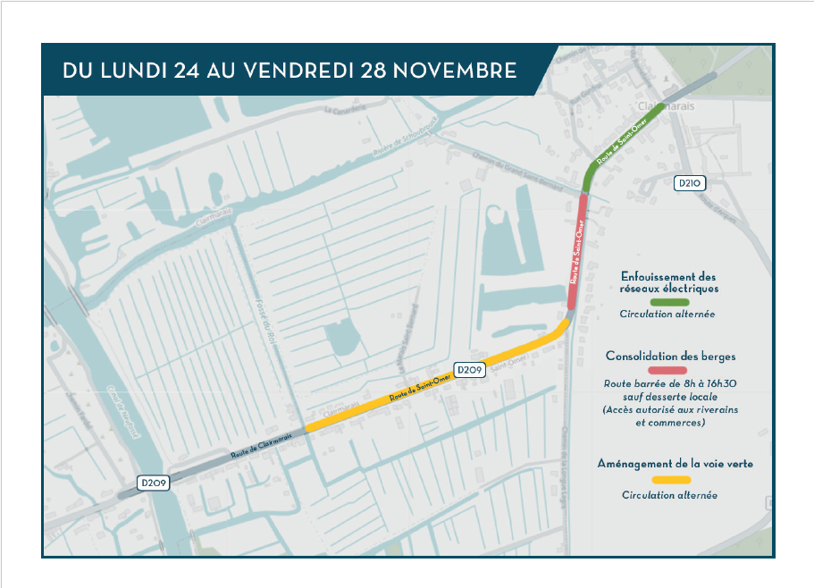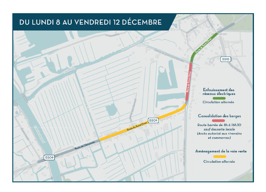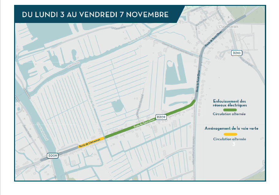 La Ville de Saint-Omer, la Commune de Clairmarais, la Communauté d’Agglomération du Pays de Saint-Omer et le Département du Pas-de-Calais se sont engagés collectivement dans le réaménagement de la route de Clairmarais, entre le pont du canal de Neufossé et l’église de Clairmarais.