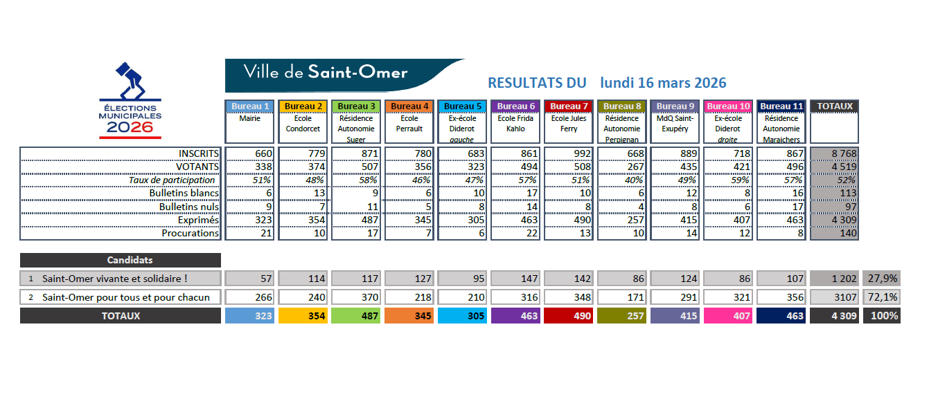 Ce 15 mars 2026 ont eu lieu les élections municipales pour la Ville de Saint-Omer. Retrouvez ci-dessous les résultats.